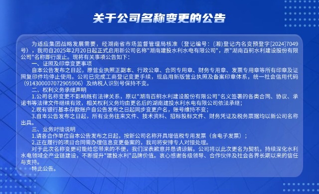 2022年9月,原湖南建工集團(tuán)與原湖南交水建集團(tuán)合并組建湖南建設(shè)投資集團(tuán)。原雙方集團(tuán)旗下的湖南百舸水利建設(shè)股份有限公司和湖南建工集團(tuán)水利水電工程公司合并為湖南建投百舸水利公司,實(shí)行兩塊牌子(百舸水利、建工水利)管理,為湖南建投集團(tuán)唯一水利建設(shè)企業(yè)。2024年9月,公司正式更名為湖南建投水利水電有限公司(簡稱湖南建投水利),統(tǒng)籌管理“百舸水利”“建工水利”“施工公司”“疏浚公司”等子品牌。
